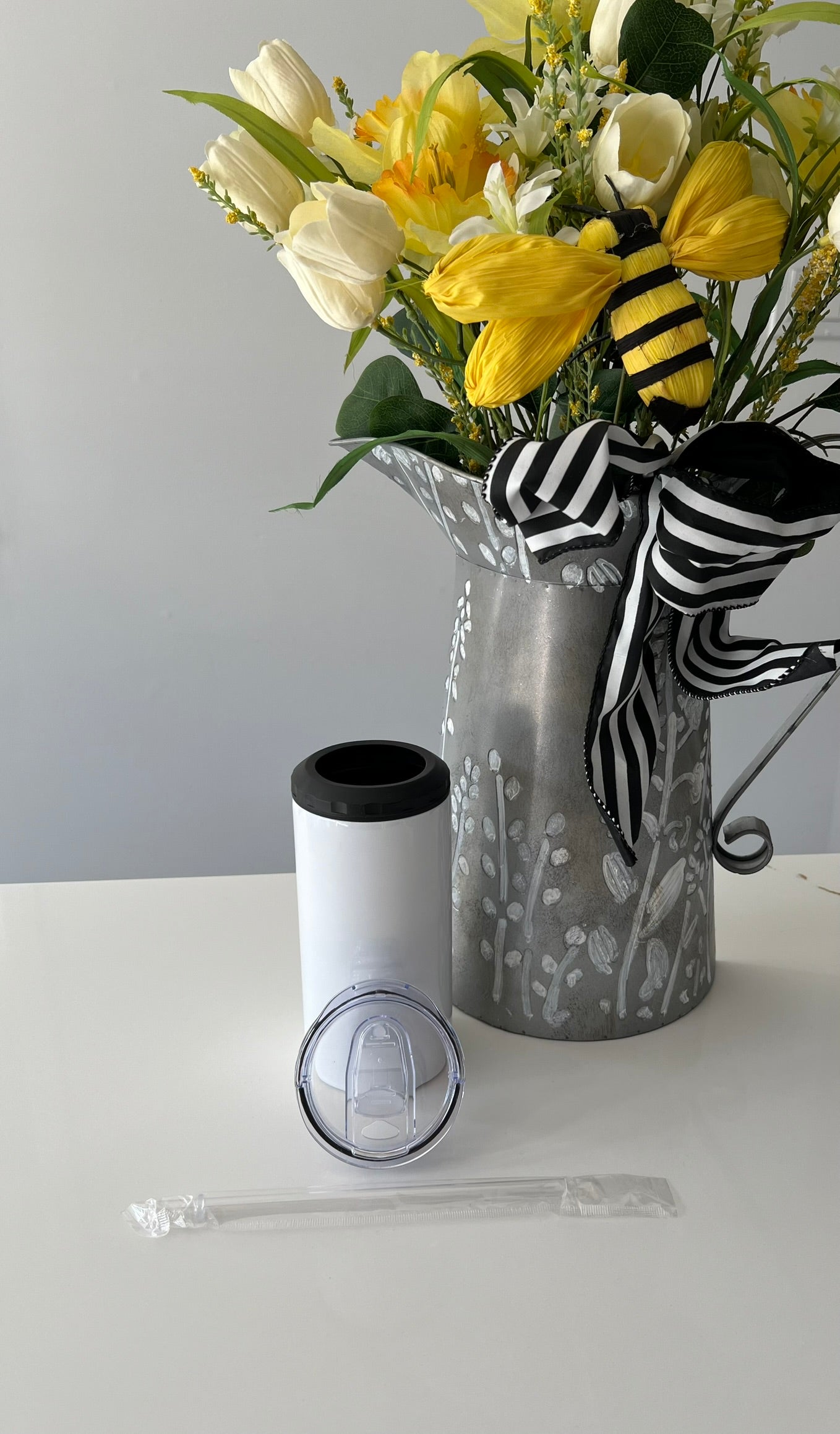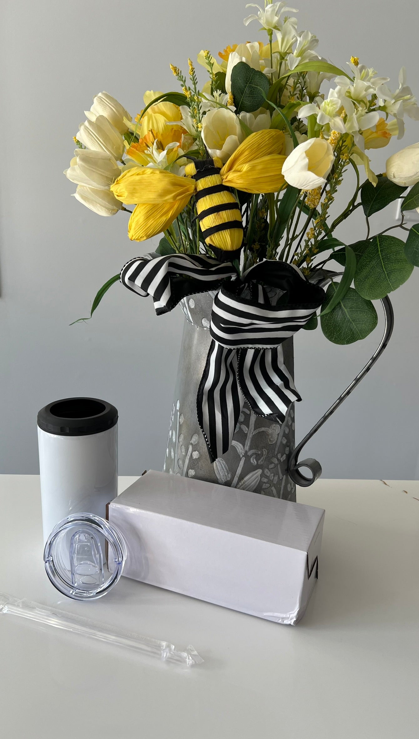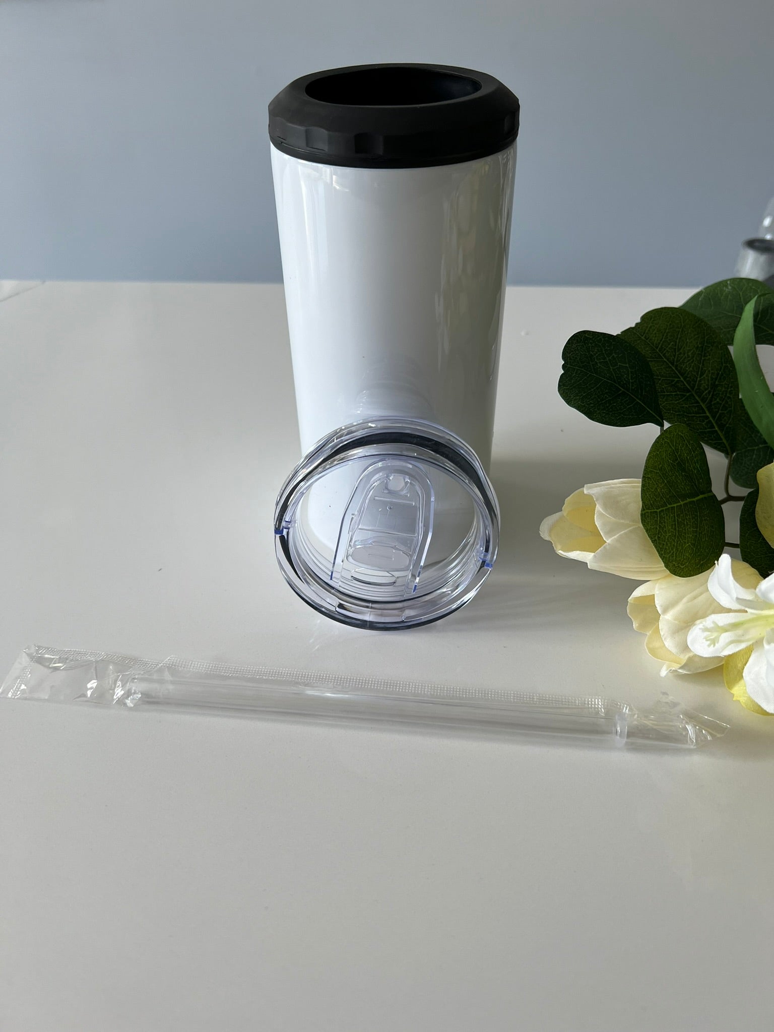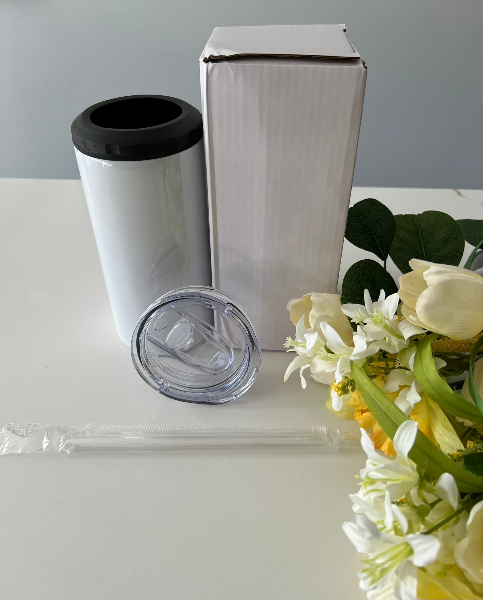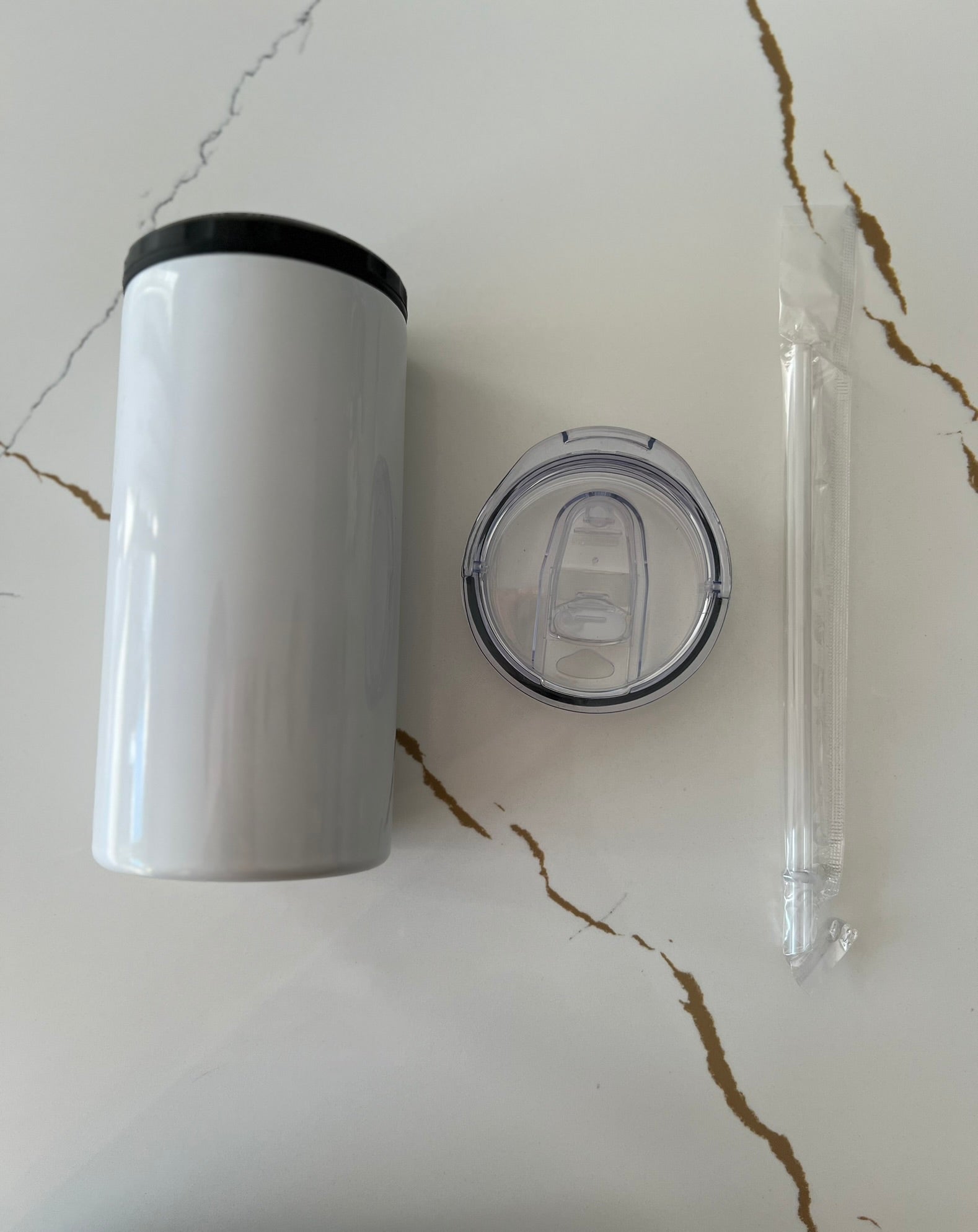 Can cooler comes with 2 lids, a straw and a white box