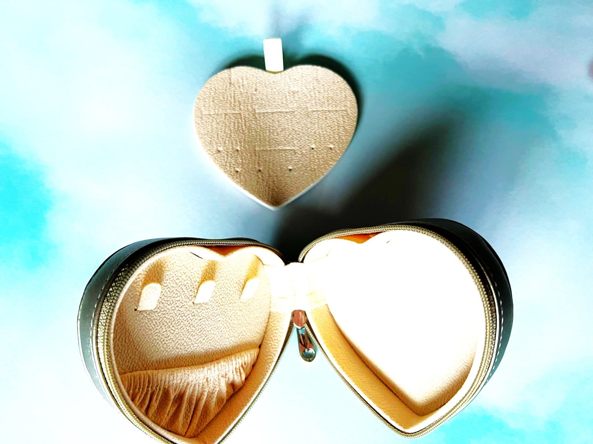 Has a zipper and has a detachable heart shaped earring/ring holder